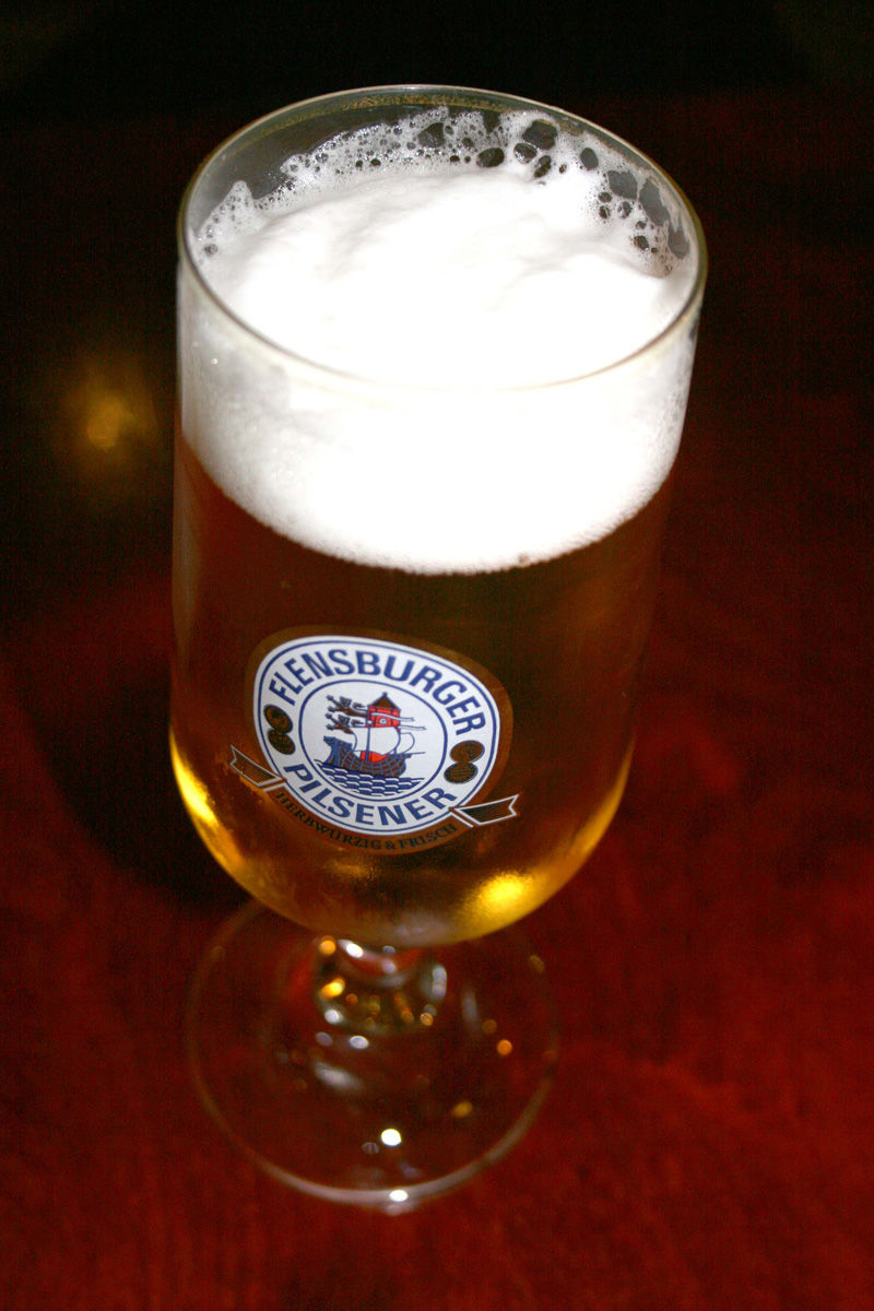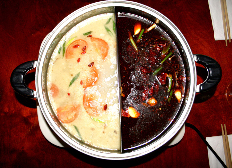 Zwei Hälften nennt der Topf sein Eigen. Links brutzelt ein Gemisch aus Brühe, Zwiebel, Lauch, Tomate und Bambus – „die normale Seite“. Rechts schießen uns Knoblauch, Chili, Pfeffer, Gewürze und Lauch in die Augen – „die scharfe“. Beide dürsten nach schnell zu garendem Gut. Also hieß es, rasch die Platten am Büffet zu füllen. Alles herrlich dünn und schlank portioniert. Spinat, Gemüse, Champignons, Lamm, Rind, Rotbarsch, Scampi, Algen, Fischbällchen, Kartoffeln, Tofu in allen Varianten und und und…. Die Platte füllt sich im Nu. Der Magen langsamer. Gut Ding will Weile haben. Alles schön dezent portioniert. Gut so. Mit Stäbchen geht’s hinein in den Topf, mit einem Sieb befördert man die Dinge wieder aus dem Sud und muss höllisch aufpassen, dass man nicht die Gewürze mit hinausfischt, dann kann man sein Getränk – bei mir wars ein wenig stilechtes großes „Flensburger“ – schon mal auf Ex trinken. Sowieso ist die Schärfe ambitioniert, aber nicht unangenehm. Sie nährt die Vorstellung, was bei chinesischer Hausmannskost so Standard ist. „Spicy“ jedenfalls kann sehr vielseitig definiert werden. Mir gefällt mit der Zeit die Brenn- und Ablösch-Kombination, so dass ich mich oft auf die scharfe Seite schlage.