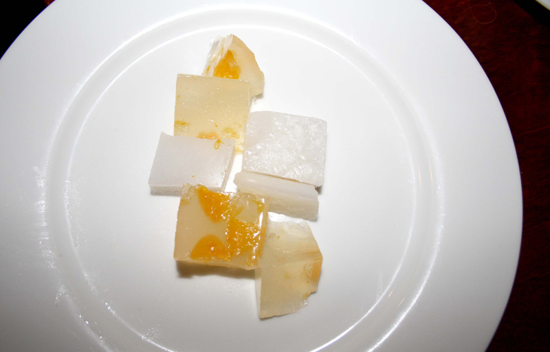 Nachtisch gabs eigentlich nicht mehr, zumindest keinen zusätzlich bestellbaren, dafür war das Feurtopf-Fest schon ausgiebig genug. Da das Plattenbefüllen für den Feuertopf nach diesem eigentlich abscheulichen All-you-can-eat-Motto abläuft, hört man ja ohnehin schon meist viel zu spät auf. Das ist ja das perverse. Mit Geschmack und Genuss hat das dann irgendwann ja nicht mehr so viel zu tun. Eher mit nicht aufhören können und wollen. Deswegen reden die stumpfinnigen All-you-can-Eater ja irgendwann nicht mehr vom wovon, sondern nur vom wie viel. Ihhh Bäh! Im 5 Flavor hatte das Nicht-Aufhören-Müssen jedoch aufgrund des Variantenreichtums durchaus seine Berechtigung. Zum Nachtisch musste dann also auch erneut die kalte Ecke herhalten, denn dort gab es auch eine Schale mit Puddingstücken. Pudding ist nett gesagt, denn diese wabernden gummiartigen Quader strotzten so vor Gelantine, dass man sie auch als Spielzeug hätte benutzen können. Im Mund fühlte sich das Ganze dann wie ein weich gekochter Flummi an, den es mal in fruchtig und mal in ingwerhaltig gab. Beides riss mich nicht vom Hocker, gerne hätte ich die Pudding-Dinger straight ins Dampfbad gespuckt und sie ihrer jämmerlichen Konsistenz beraubt. Aber es blieb beim braven Zerkauen, Erdulden, Erlutschen, aber auch bei nur einem Versuch pro Pudding-Stück. Satt war ich ja ohnehin schon längst. So ein Nachspiel hatten die sich munter im Magen türmenden Garnelen gewiss nicht verdient gehabt.