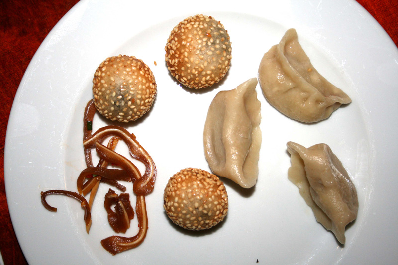Wählt man den Feuertopf (14,90 Euro), wählt man auch die freie Auswahl am großen Büffet, des sehr sorgsam von den 5 Flavor-Frauen gepflegt wird. Dazu zählt auch eine kalte, nicht fonduefähige Ecke, die uns kurzerhand als Vorspeisenreservat diente. Während also bereits der Topf in der Mitte auf original chinesischer Kitsch-Heizplatte nach seiner Betriebstemperatur strebte, sorgten die etwas trockenen Sesam-Bällchen mit Mohn-Füllung für Knabberspaß vorab. Sehr viel besser gefielen jedoch die an russische Pelmeni oder polnische Pierogi erinnernden Teigtaschen. Kleine kompakte gekochte Gebilde mit einem aus prägnanten Gewürzen und Hackfleisch bestehenden Innenleben. Ich weiß gar nicht was es genau war, aber die waren gut. Unsere kleine chinesische Connaisseurin legte uns noch die Schweinepfoten ans Herz. „Ein Klassiker in China“. Ein kleiner Test genügte jedoch und ich zeigte der Pfote die kalte Schulter, um mich den warmen Dämpfen zu öffnen.